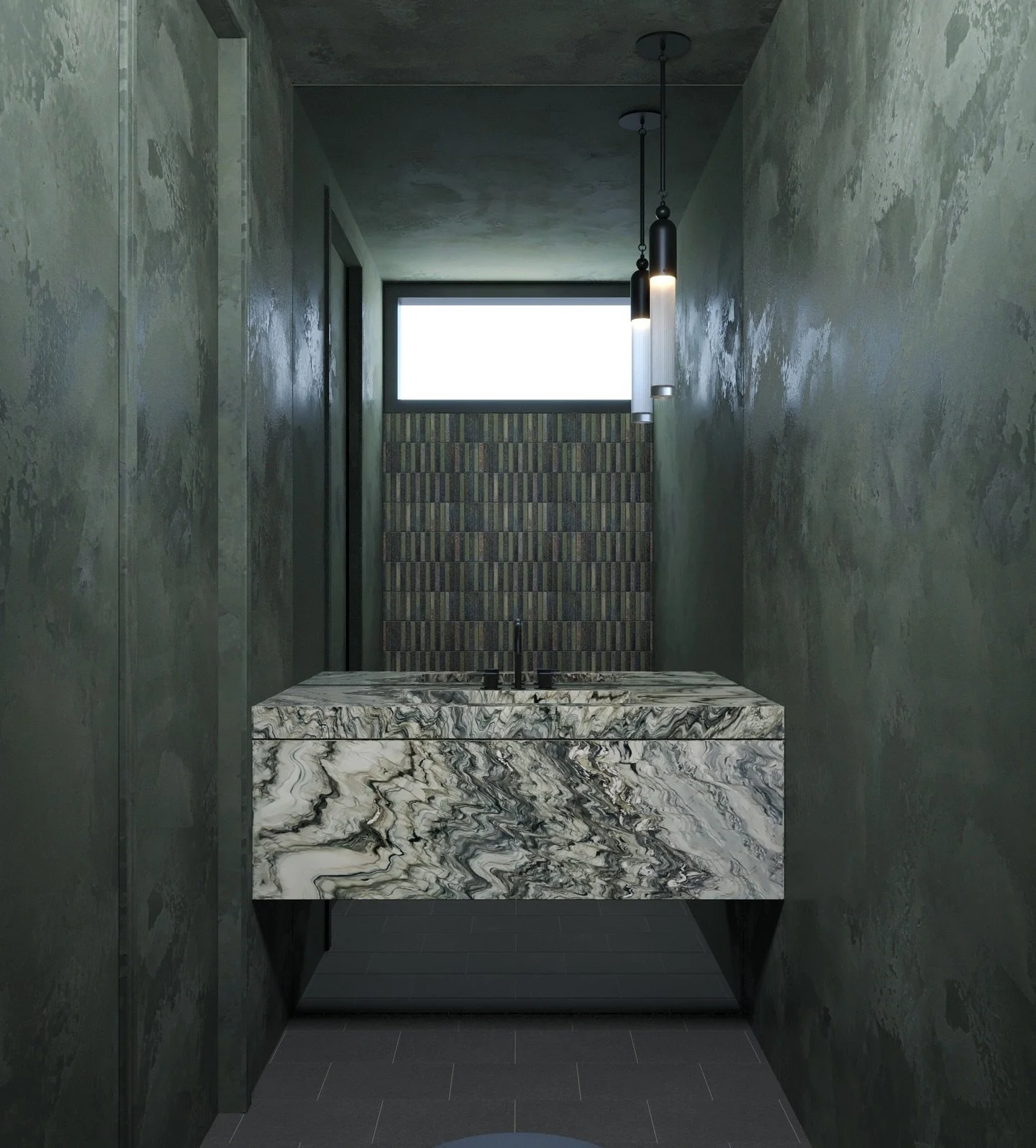 View fullsize SNEAK-PEEK - Mar West, Tiburon // Check out our final design for the powder room in our Tiburon project. This moody power has a wabi sabi feel, gives a zen feeling, and plays with the optical illusion with the mirror making it appear to be floating,