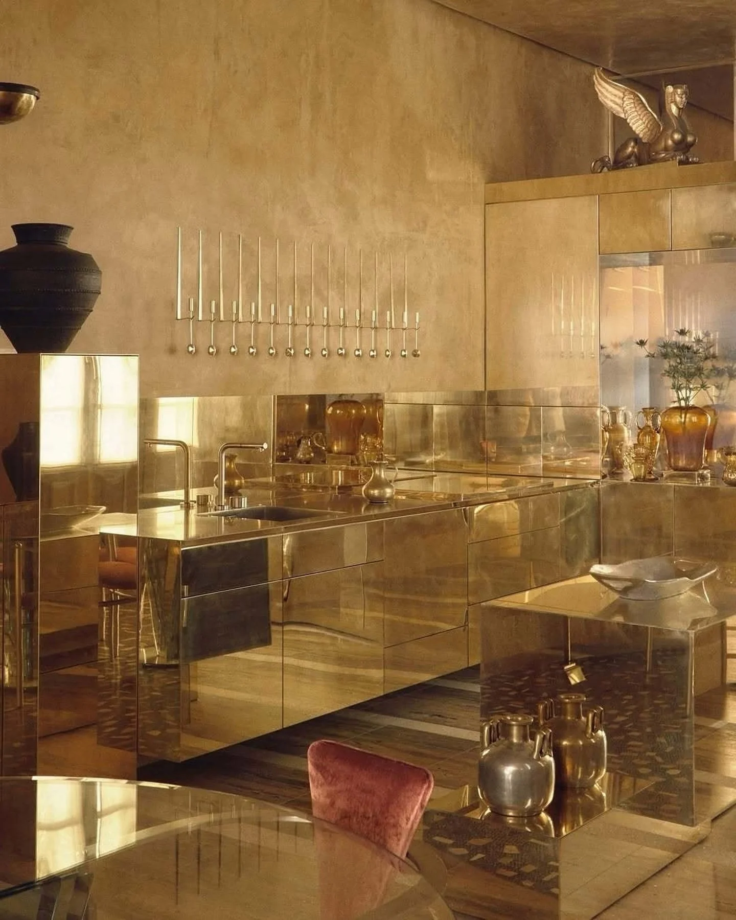 View fullsize Have you ever seen a more *magical kitchen*, well crafted details and a wonderful mix of areas with color and rooms with more neutral spaces? The use of reflection in this apartment is elevated into an art form. Swooning over here. This is the very c